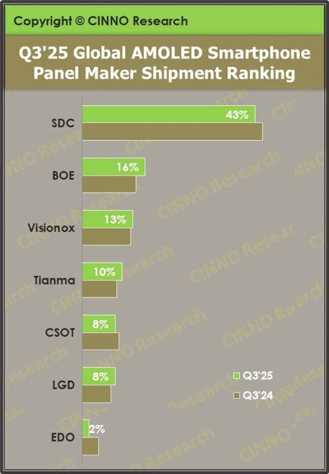 柔性AMOLED已成为智能手机面板市场的绝对主力,第三季度在全球AMOLED市场中占比突破80%。这一技术趋势正推动全球显示产业格局的重构:韩国厂商份额同比下滑至43.8%,而国内厂商则以56.2%的份额实现反超。